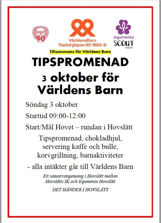 Söndagen den 3 oktober annordnar Equmenia Hovslätt och Hovslätts IK en tipspromenad där alla intäkter går till Världen Barn, vår framtid. Start 09:00-12:00 på Hovet och förutom tipspromenad så erbjuds det fika, korv, chokladhjul och barnaktiviteter. Vi syns på Hovet Välkomna