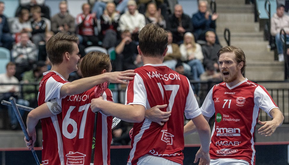 Hovslätt tog under lördagen sin femte raka vinst när man besegrade Fristads GoIF hemma i A-Hallen med 13-9 i en målrik tillställning. Men, man fick jobba hårt för vinsten. Den första perioden blev en intensiv sådan med en hel del fysiskt spel. Gästerna chockstartade och hade en tremåls-ledning efter halva perioden. Dock skulle Hovslätt spela upp sig och efter den första akten hade vi 2-3 på tavlan. Hovslätt tog tag i taktpinnen i den andra perioden och stod för det mesta av bollinnehavet och när Max Johansson efter 01:51 reducerade till 3-4 så var det startskottet på en fin period av hemmalaget. Trots ett par mål i baken, så stod det 9-5 till hemmalaget och man hade vänt. I den tredje perioden ökades tempot betydligt och spelet i sig blev inget direkt skönspel. Gästerna närmade sig i målprotokollet efter att ha fått in ytterligare fyra mål, men Hovslätt ville inte vara sämre och stod även de för fyra mål. Fristad kom aldrig igen och serieledaren kunde därmed ta sin femte raka vinst. Närmast väntar Strängnäs på bortaplan den 28 oktober för våra herrar. (Foto: Marcus Vilson/ Hovslätt Media)