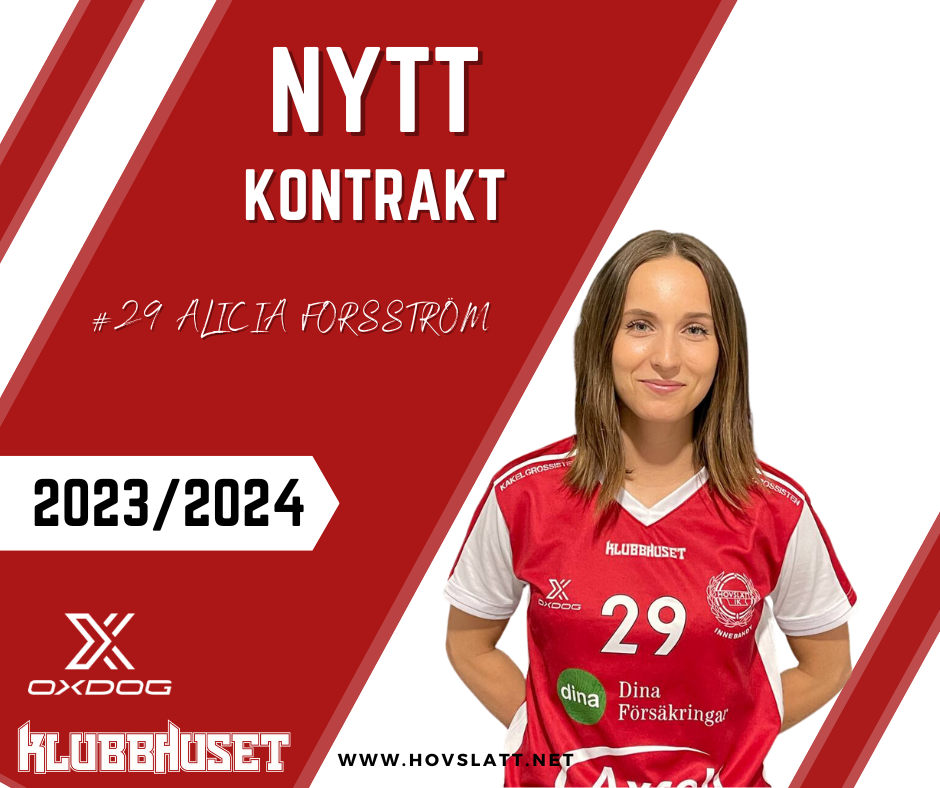 Lagbygget inför kommande säsong är i full gång för Hovslätt Dam och i dag kan vi meddela att Alicia Forsström valt att fortsätta karriären i Hovslätt. Alicia Forsström har skrivit på nytt kontrakt för kommande säsong och därmed går den rutinerade centern in på sin femte säsong med Hovslätt Dam. Alicia producerade 29 poäng på 27 matcher under fjolåret, fördelat på 11 mål och 18 assist. Men, nu kan vi räkna med att få se ytterligare poäng från den duktiga centern. För Alicia var det ingen tvekan om var hon skulle spela kommande säsong; - Jag tror att det kan bli bra med det här samarbetet som nu inleds och jag upplever att Hovslätt passar mig bra. Dessutom har Robin som tränare varit oerhört viktig för oss spelare i laget under föregående säsong. Han var ett fantastiskt stöd för mig under säsongen, som faktiskt blev min första skadefria säsong i Hovslätt, så när han blev klar som tränare även i år blev det tydligt att jag ville fortsätta köra. Kontraktet är skrivet för kommande säsong.