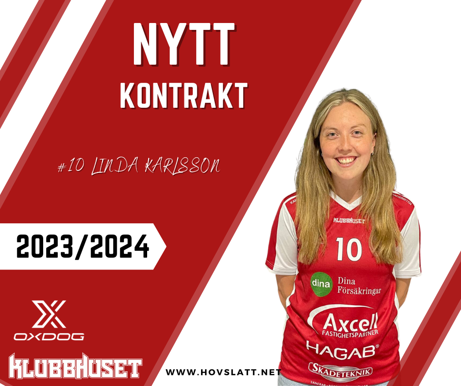 Lagbygget inför säsongen 2023/24 fortsätter för Hovslätt Dam och i dag kan vi meddela att rutinerade backen Linda Karlsson valt att fortsätta i Hovslätt. Rutinerade backen Linda Karlsson har gjort sitt val och i dag kan vi meddela att hon valt att skriva på för ytterligare en säsong i den rödvita dressen. En påskrift vi är glada över. Linda är en av pusselbitarna i tränare Robin Eks lagbygge inför kommande säsong och att hon nu valt att fortsätta karriären i Hovslätt Dam, så är ytterligare en viktig del på plats. Linda går nu in på sin fjärde säsong i klubben och under säsongen 2022/23 stod hon för 15 poäng på 26 matcher, fördelat på 6 mål och 9 assist. Det var också hennes poängmässigt bästa säsong sedan hon kom från Jönköpings IK 2020/21. Och vi kan nog garanterat fortsatt räkna med en del poäng framåt från hennes backplats. - Jag tycker att det ska bli roligt och spännande att fortsätta lira i Hovslätts IK. Det känns bra att Robin ska fortsätta som tränare, då han har varit en stor stöttning i min utveckling som innebandyspelare under förra säsongen. Jag hoppas att kunna bygga vidare på det och ta ytterligare kliv. Laget är ett blandat gäng som har väldigt roligt både på och utanför plan, vilket gjorde beslutet lättare för mig att satsa på Hovslätt nästa säsong, säger Linda Karlsson. Kontraktet med Linda är skrivet för säsongen 2023/24.